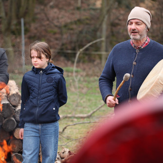 Sarah brachte uns den Zauber von Mama Cacao, Claudia den Klang der roten Trommel, Stephan die Mundharmonika, die Kinder brachten die Freude am Feuermachen und das Beobachten, Aaron & Viktor die Kraft & Schönheit zweier Brüder, die Hunde brachten die Stöcke. Schnell war das Feuer entzündet, die Steine - jeder von ihnen gesegnet - begannen, sich zu erwärmen.